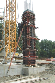 Het storten van de kolommen is een arbeidsintensief karwei. Maar liefst 24 kolommen zullen straks de toren gaan dragen. Zij hebben daarbij elk een afmeting van 70 x 70 centimeter. Een uitzonderlijke afmeting, waardoor het moeilijk was om de goede bekisting te vinden. Deze bijzondere bekisting is aan de onderkant rondom voorzien van stalen binten (kransen). Zij moeten de bekisting behoeden voor uit elkaar spatten tijdens het beton storten |