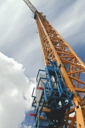 Op 19 juli, één dag voor de bouwvakvakantie is de lang tegemoet geziene lift aan de kraan gemonteerd. Het betekent voor Henk Sieben dat hij niet meer elke dag z'n zestig meter zal moeten klimmen en dalen. De uitnodiging om eens boven bij hem op visite te komen is inmiddels in dank aangenomen. |