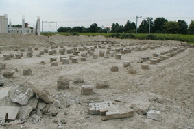 Eind juli, de bouwput van de tweede toren ligt er troosteloos bij. De koppen van de heipalen zijn uitgegraven en niets wijst op een systematisch geheel waarop ooit een woontoren zal moeten staan. Toch zal ook hier over een paar maanden een fundering verrijzen waarbij elke centimeter op de tekentafels is uitgedacht. |