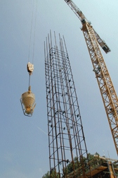 Bij de start van de bouwvakvakantie zijn alle kolommen gestort. Straks zal de bouw in een snel tempo verder gaan. Dan wordt begonnen met het storten van de wanden en de vloeren. De toren zal dan één verdieping per week gaan klimmen! Wie zich afvraagt of de schuine kolommen op de vier hoeken gestort zijn voor de sier, kan meteen gerust gesteld worden. Het is om de stabiliteit van de toren te waarborgen. |